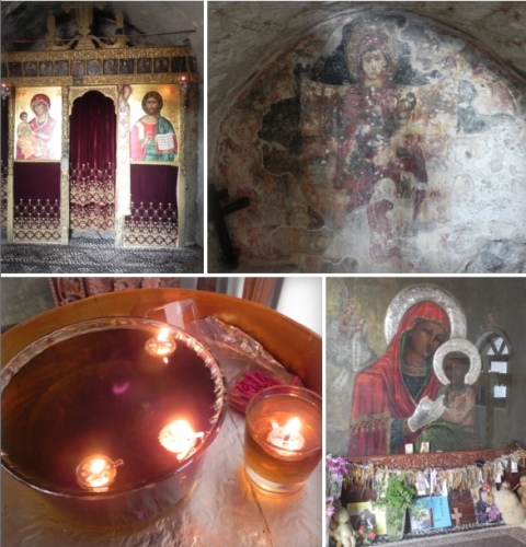 L’accesso a ciò che resta dell’antica struttura sacra è seminascosto da pareti bianche e semplici, quasi non si capisce che si sta entrando in un santuario. Un paio di camere semplici, di dimensioni ridotte quasi a piccole grotte, contengono affreschi e dipinti raffiguranti la Madonna e il Bambino, non molto in buono stato purtroppo, mentre in una zona più ampia sulla destra dell’ingresso campeggia una grande immagine ad affresco della Vergine Tsambika, davanti alla quale sono stati lasciati tantissimi ex-voto d’argento, quadri, icone e riproduzioni di bambinelli di cera portati in offerta per rendere testimonianza e omaggio per la Grazie ricevute.